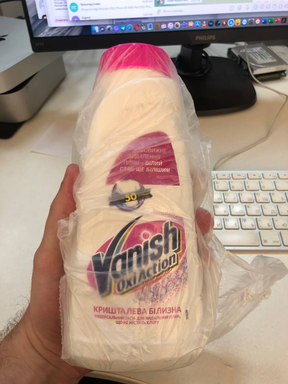 - наливаю четверть флакона пятновыводителя в пластиковую герметичную емкость